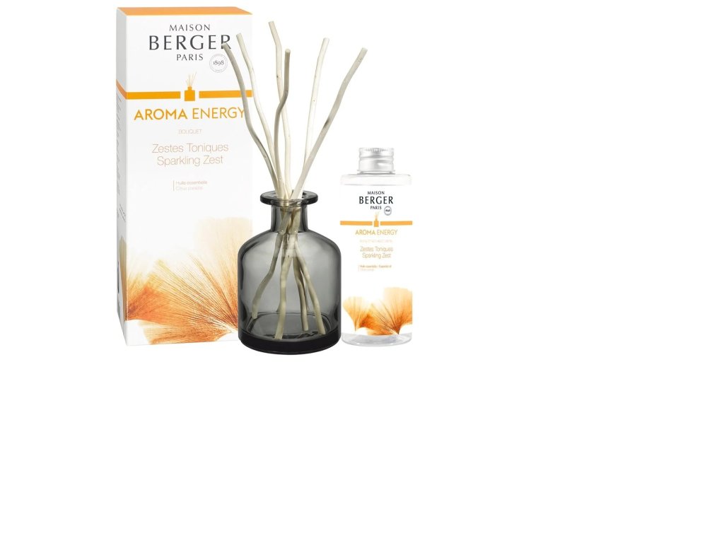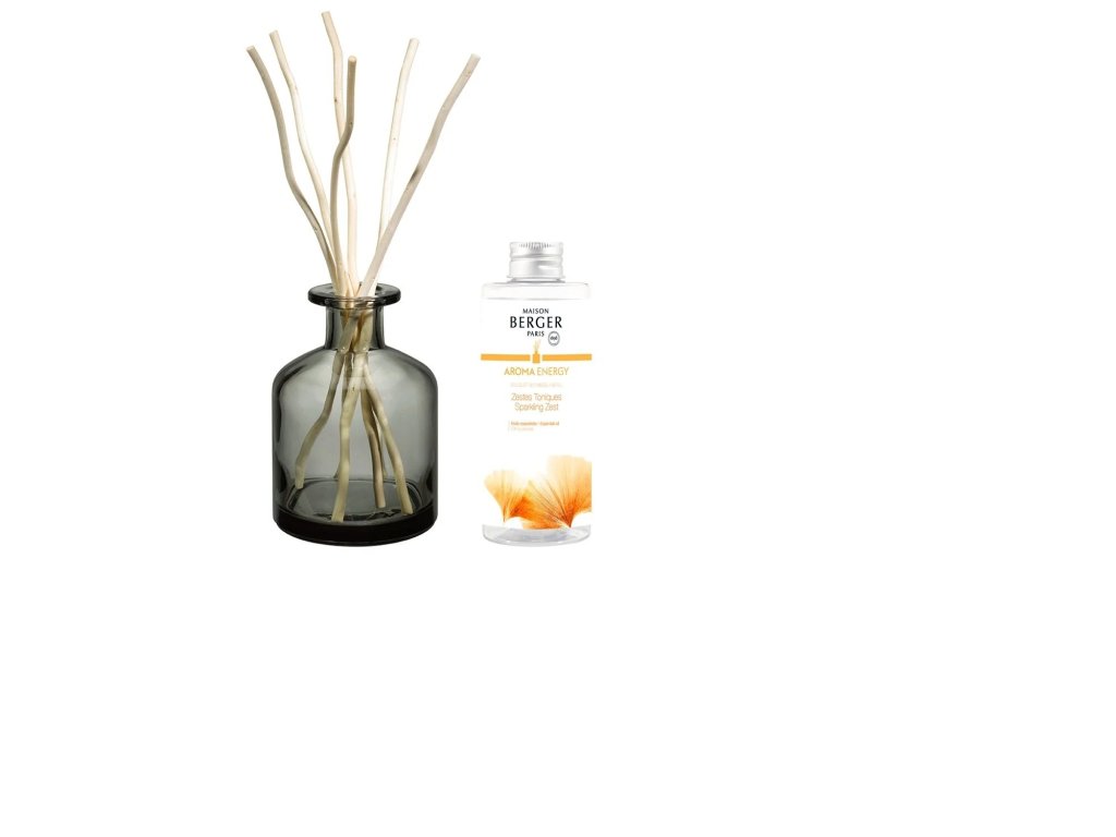 Užite si energiu vo vôni s difuzérom Aroma Energy francúzskej značky Maison Berger Paris. Moderný design samotného difuzéra v tvare flakónu na lieky a v trendy sivej farbe sa bude hodiť do všetkých interiérov. Vďaka vŕbovým tyčinkám dostáva celok prírodný vzhľad. Spoločne s náplňou Aroma Energy – Čerstvé tonikum vám pomocou esenciálnych olejov pomôže načerpať energiu. Vôňa pre dynamickú a energickú atmosféru vám pomôže rozvíjať pozitívny a osviežujúci pocit. Zlepšuje koncentráciu, kreativitu a pomáha znižovať úzkosť. Difuzér jemne a vytrvale parfumuje okolie po dobu až 8 týždňov. Intenzitu vône jednoducho ovplyvníte množstvom vonných tyčiniek. Priemer difuzéra: 7,8 cm, výška i s tyčinkami 23,5 cm.