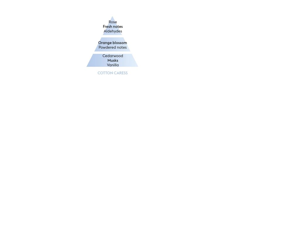 Vôňa ponúka upokojujúcu jemnosť a ľahkosť čistoty, ktorá je veľmi komfortná a utvára pohodovú atmosféru plnú elegancie. Táto kvetinová vôňa s nevinnou arómou ruží otvára svoje srdce tónmi pomarančovníka a púdru. Základ parfumu tvorí céder, pižmo a sladká vanilka.